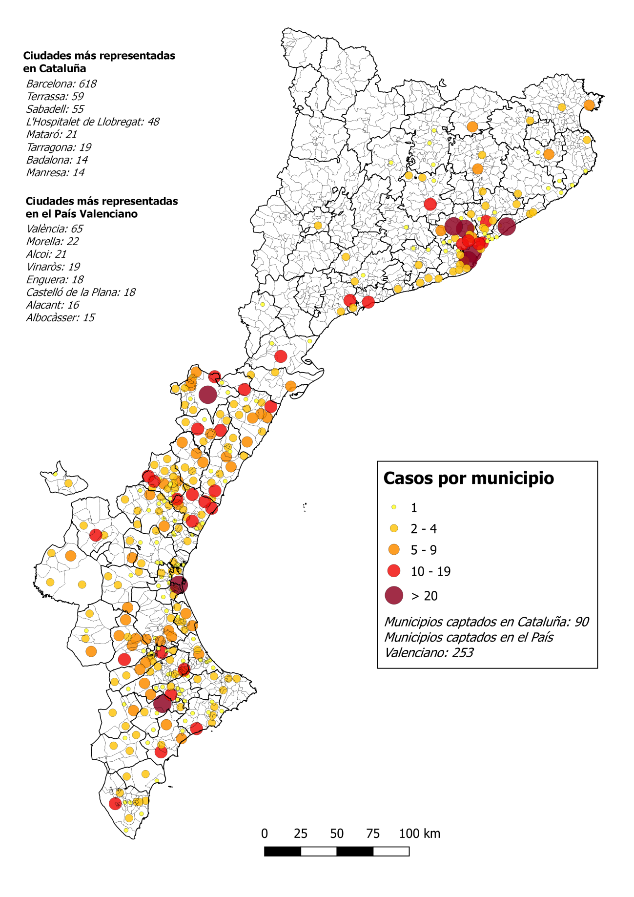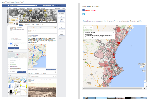 Para visualizar el proyecto y fomentar la participación, se creó una cuenta de Veus Valencianes en dos redes sociales, Twitter y Facebook, en las que se colgaban noticias relacionadas con la demografía, la cultura valenciana, el proyecto o el grupo de investigación. Asimismo, en la web del proyecto, además de los enlaces a las encuestas, se ubicó un mapa del País Valenciano donde, a medida que se iban respondiendo cuestionarios, se señalaban el número de personas que participaban por municipios de origen (Figura II). Igualmente, en otros apartados se describía en qué consistía el proyecto y se animaba a participar en el más allá del cuestionario, por ejemplo en las entrevistas en profundidad. 5