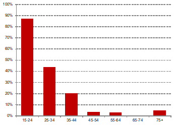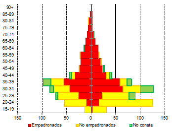 La primera aportación específica del abordaje a través de la CC ha sido evidenciar que una proporción importante de las personas que respondieron el cuestionario, alrededor del 42%, vivían pero no estaban empadronadas en Cataluña. Tal como se observa en el Gráfico 2, entre los adultos más jóvenes más del 80% se encontraban en esa situación, reflejo de movimientos migratorios asociados a los estudios y/o el primer empleo que en muchos casos no conllevan su empadronamiento en Cataluña, o como mínimo no en un primer momento. Dicha situación no es, sin embargo, nada novedosa y viene a confirmar la importancia de aquello que se ha dado en llamar “empadronamientos atípicos”, sobre todo para un importante sector de la población con estudios universitarios situado entre los 20 y 24 años (Sabater y Ajenjo, 2005). A partir de los 45 años ese porcentaje se sitúa por debajo del 10%, observándose un ligero repunte en la población de 75 y más años que estaría relacionado con fenómenos de doble residencia por razones familiares o de salud en las que estas personas deciden por motivos sentimentales y/o económicos fijar o mantener su residencia legal en la Comunitat Valenciana.