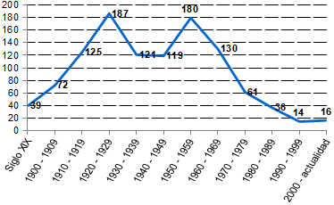 El cuestionario sobre descendientes fue contestado por 620 personas, de las cuales el 53% eran mujeres, con una estructura por edad más homogénea que la observada en el cuestionario de nacidos. Así, el 27% de los que respondieron tenían de 15 a 29 años, el 22% de 30 a 44 años, el 35% de 45 a 59 años, y el 16% restante 60 o más años. Esto significa que, además de un menor sesgo, se tiene información referente a las corrientes migratorias más recientes, aportada por la población más joven, y sobre las más antiguas, gracias a la población adulta-madura y anciana. Efectivamente al comprobar los años de llegada de los antepasados de los participantes se reflejan perfectamente las dos oleadas más antiguas del siglo XX (Gráfico 5): una primera en torno a los años 20, al final de cuya década los valencianos llegaron a representar su máximo del siglo en Cataluña, y una segunda en torno a los años 50, en un contexto de reinicio de las grandes migraciones interiores tras la posguerra (Rodríguez, 2010), agravadas a su vez por una ola de frío polar que en febrero de 1956 afectó con especial virulencia a algunas zonas del interior valenciano (Núñez, Muedra y Aupí, 2006).