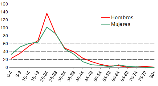 En el caso del patrón de movimientos por edades de los antepasados hay que tener en cuenta la limitación que el filtro de la memoria, convertido en narrativa familiar, puede ejercer sobre los resultados. Es decir, que muy probablemente lo que se recuerda o lo que se manifieste sobre las trayectorias migratorias de los antepasados tienda a señalar solo los hitos que relacionan acontecimientos vitales en la movilidad. De esta manera, se destaca únicamente un máximo en edades jóvenes en torno a los 20-24 años (Gráfico 6). Asimismo, al ser una encuesta que hace referencia a los antepasados, independientemente de su edad, también se tienen reflejados los movimientos producidos en las edades infantiles y juveniles. La cuestión, no obstante, es si los movimientos producidos en la adolescencia reflejan migraciones de arrastre protagonizadas por familias o bien responden a personas que en edades jóvenes vinieron a trabajar a Cataluña. El plantear una pregunta con respuesta voluntaria sobre la ocupación desempeñada por el antepasado antes de llegar a Cataluña y una vez establecido hubiese ayudado a conocer este aspecto. Además, hubiera enriquecido nuestros datos de manera considerable y no hubiese supuesto un esfuerzo extra para el participante, al no obligarle a responder para continuar con el cuestionario.
