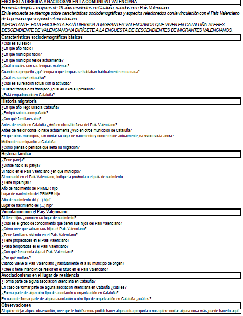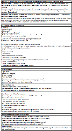 Para la ejecución del proyecto se diseñaron dos cuestionarios, uno dirigido a la población valenciana que vivía en Cataluña y otro dirigido a la población residente en Cataluña con algún antepasado de origen valenciano. En esos cuestionarios, aparte de preguntar por algunas características sociodemográficas básicas, se inquiría sobre cuestiones imposibles de abordar con fuentes tradicionales tales como la vinculación con el País Valenciano 4 y su valoración, el mantenimiento de propiedades o familiares en dicho territorio, la frecuencia de los viajes al País Valenciano y sus motivos, el grado de conocimiento del mismo o la pertenencia a algún tipo de asociación, por dar algún ejemplo.