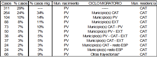 Pese a los referidos sesgos, la utilización de la CC nos ha permitido percibir otras características de los procesos migratorios que no pueden captarse en las fuentes tradicionales. Es el caso de las motivaciones, el realizar el movimiento solo o acompañado, o los sitios previos en los que se residió, además del lugar de nacimiento (si es que los hubo). Tal como se puede apreciar en la Tabla 3 un 30% de los encuestados responde haber realizado una única migración entre el municipio de origen y el de residencia en Cataluña, siendo ese porcentaje claramente superior para los no empadronados –al tratarse básicamente de estudiantes– con un 36%, patrón que según las entrevistas en profundidad realizadas difiere notablemente de las pautas residenciales y de movilidad observadas entre los inmigrados durante los años cincuenta y sesenta. Destaca también que una de cada cinco personas que respondieron presenta un ciclo migratorio con algún periodo de residencia en el extranjero.