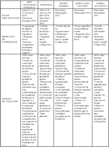 En nuestro análisis nos centramos en el estudio de los periodos electorales, entre 2014 y 2015, porque creemos que es en ellos donde primero se ensayan estas prácticas y porque es en las elecciones cuando los partidos emergentes compiten por redefinir la legitimidad democrática del sistema. En este sentido, los procesos electorales encierran la clave de la legitimidad de los sistemas democráticos, y el modo en que los diferentes partidos gestionan estos procesos pone en evidencia su compromiso con los valores democráticos. Por ejemplo, el modo en que un partido confecciona sus listas electorales dice mucho de su grado de democracia interna. Así, mientras que algunos partidos de la transición aplican sistemas de decisión jerárquica (PP) y en otros solo se incorporan sistemas de participación limitada (las primarias del PSOE), en los partidos emergentes se establece como práctica generalizada las primarias abiertas, en las que toda la ciudadanía puede participar en la elección de candidatos.