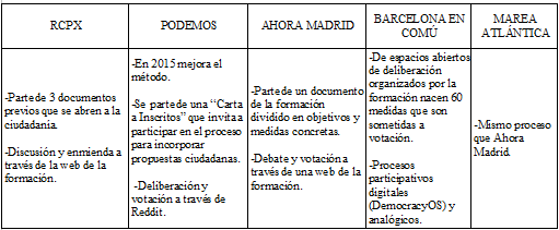 En el caso de Podemos, en las elecciones generales de 2015 mejoró su sistema participación en la elaboración del programa electoral. Este proceso comienza con una “Carta a Inscritos” en la que se invita a participar y se explica el procedimiento. El objetivo era incorporar 20 propuestas ciudadanas que cumplieran con los criterios de “respaldo democrático, viabilidad económica y consistencia jurídica” (Podemos, 2015a). En la fase inicial, la Secretaría de Programa convocó reuniones de los responsables de área con los Círculos y otras organizaciones de la sociedad civil. En la fase deliberativa, se invitaba al debate a través de “Plaza Podemos”, un espacio virtual creado en Reddit (Podemos, 2015b) y en el que la deliberación se dividía en 5 grandes áreas. Las propuestas ciudadanas con más de 100 apoyos y las más votadas de la semana pasaban a ser consideradas por el partido. Finalmente, se elaboró un borrador para concretar las propuestas, que se expusieron para su votación en la plataforma digital.