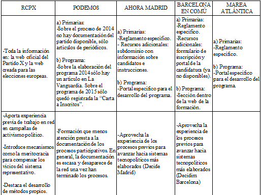 Todas estas formaciones han incorporado de un modo u otro las lógicas del trabajo en red para generar innovaciones tecnopolíticas, si bien, no siempre se hacen en la misma medida. En primer lugar, hay que tener en cuenta que las formaciones que se presentaron en 2014 abrieron el camino a las candidaturas municipalistas de 2015. En especial, la RCPX aportó su experiencia previa de trabajo en red en campañas de activismo político para generar esta ola de innovaciones tecno-democráticas.