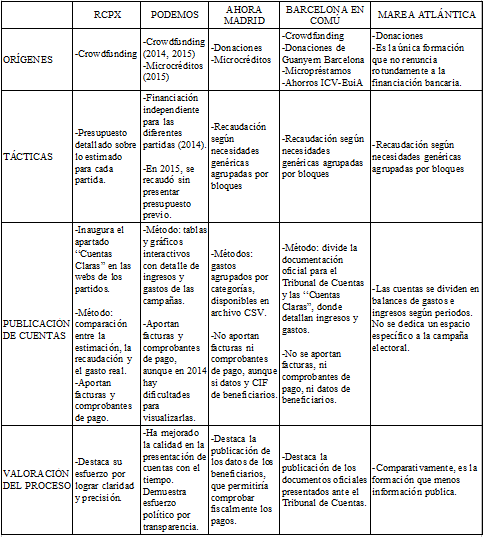 Por otro lado, también es relevante comparar hasta qué punto cada una de estas formaciones aportaba información respecto al presupuesto en el momento de pedir donaciones o microcréditos. En el crowdfunding de la RCPX se ofrecía un presupuesto detallado sobre los gastos estimados para cada una de las partidas, mientras que Podemos optó por financiar de forma independiente diferentes partidas, como la compra de una furgoneta o la realización de un spot publicitario (Vera, 2014). Esta dinámica cambió en las elecciones autonómicas y generales de 2015, en las que se recaudó para la campaña en su conjunto sin presentar un presupuesto detallado de antemano.
