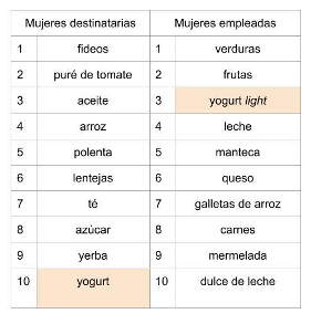 A continuación presentamos un cuadro comparativo con los diez alimentos más repetidos por los dos grupos, coloreando los alimentos comunes en ambos.