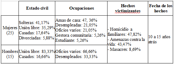 Para escoger los participantes se llevó a cabo un muestreo intencional en el Punto de Atención a Víctimas de Cartagena, en donde se encontraban a la espera de recibir apoyo psicosocial. Se invitaba a participar en las reuniones indicando los objetivos del proyecto hasta completar un grupo de 8 a 12 personas por reunión. Se solicitaba su participación voluntaria en la investigación para la firma respectiva del protocolo de consentimiento informado y luego se cumplimentaba una ficha datos socio-demográficos. Participaron 40 personas, quienes acudieron por ayuda humanitaria al Punto de Atención a Víctimas de la Alcaldía de Cartagena, durante los meses de julio a octubre de 2018. Del total, fueron 15 hombres y 25 mujeres con una edad mínima de 35 y máxima de 60 años, residente en los barrios periféricos de estrato 1 y 2 de la ciudad de Cartagena, tales como: Nelson Mandela, El Pozón, Bicentenario, Villas de Aranjuez, Olaya, San José de los Campanos, Villa Estrella, La María. A este respecto, la tabla 1 contiene otros datos de interés.