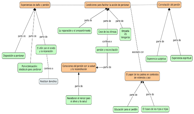 El gráfico 1 retoma de manera integral las categorías y dimensiones que emergieron en los relatos de las víctimas, y pone de manifiesto la diversidad y complejidad de la perspectiva de los participantes sobre sus nociones del perdón, la reparación y la reconciliación en un momento de incertidumbre y expectativas frente al post-acuerdo y la construcción de la paz en Colombia.