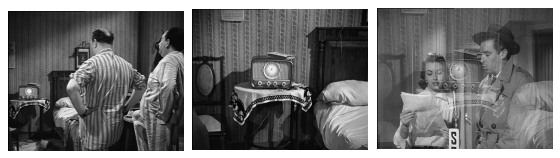 También vemos el backstage del escenario y el primer travelling horizontal de la película, así como el plano que muestra la monitorización de la realización televisiva. Ese efecto de transparencia contrasta con el mecanismo de suplantación que conlleva el concursante, que se muestra dubitativo al decir incluso su nombre.