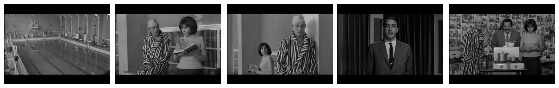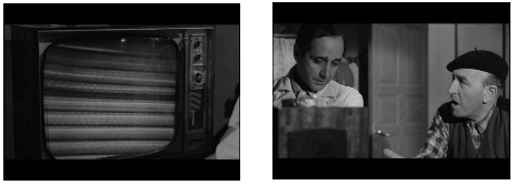 “Hay varias mesas ocupadas. De pie junto a la barra hay también un grupo de clientes. La mayoría están siguiendo la emisión”; “termina de desenvolver los terrones de azúcar, mientras el CAMARERO le lleva la copa de coñac. Los dos miran al televisor”; “Desde su punto de vista vemos la cafetería y a fondo el televisor” (TRAVELLING a P.P.) (1965: 23-24).