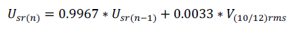 [1]where Usr(n) is the actual value of the sliding reference voltage, Usr(n-1) is the previous value of the sliding reference voltage, and V(10/12)rms is the most recent 10/12 cycle r.m.s. value. Vrms(1/2) is computed from the voltage samples in the time domain, as shown in (2) [2,4,7].
