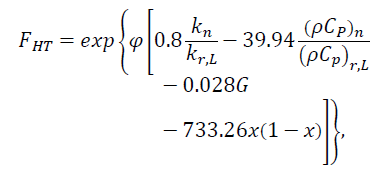 (1)where the subscript "n" and "r, L" represent the properties of nanoparticles and pure refrigerant, respectively. k is the thermal conductivity, p is the density, Cp is the isobaric specific heat, is the volume fraction of the nanoparticles, G is the mass flux and x is vapor quality. To find the heat transfer coefficient, Peng, et al. used eq. (2)[14].