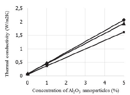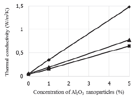 Thermal conductivity in relation to the concentration of nanoparticles is presented in Fig. 8 and Fig. 9 at 0.5 m/s and 5 m/s respectively. These graphics show an increase in thermal conductivity by adding nanoparticles at different concentrations. Al.O. nanoparticles has a great impact on R113 thermal conductivity at 0.5 m/s, while R123 and R134a have a lower thermal conductivity and a very similar tendency to increase. At 5 m/s the thermal conductivity of nanorefrigerants can have a very similar increase by adding more particles. In this example, particle size has no influence on thermal conductivity behavior.