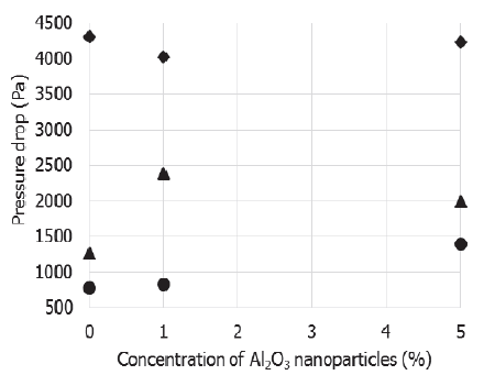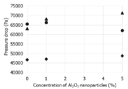 The results cannot determine the influence of the concentration of particles in the pressure drop of the pipe since the behavior is different in each case as shown in Fig. 2 and 3, where the pressure drop is presented for the three nanorefrigerants analyzed at different concentrations of nanoparticles with a mean size diameter of 30 nm, and a different Reynolds number.