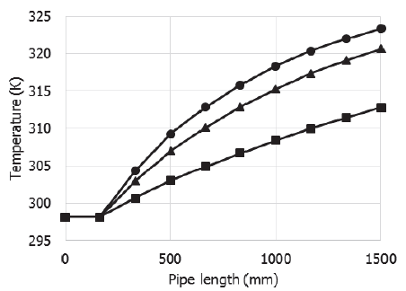 An increase in the temperature of the fluid along the pipe is observed by adding nanoparticles and the improvement is greater by increasing nanoparticle concentration as shown in Fig. 4. At the beginning of the pipe, the temperature of the three fluids is very similar, until 0.2 m when it starts to increase. The maximum values are obtained with a 5vf% nanoparticles concentration.