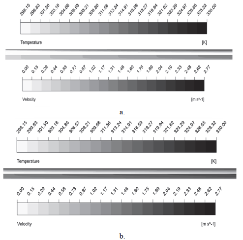In Fig. 5a. the temperature contour in the upper half of the pipe and the velocity contour in the lower half, from the inlet through 0.2 m of length are shown, in order to compare the thermal and the hydrodynamic boundary layers. This is possible because of the symmetry of the problem. It can be observed that the thermal boundary layer develops more slowly than the hydrodynamic layer, which is why there is not a significant change in temperature in the first 0.2 m of length.