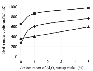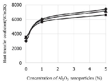 (3)The subcooled flow boiling of Al.O.-water with 30 nm nanoparticles was investigated numerically by Abedini et al. in [24] . The nanoparticles have a large effect on the thermophysical properties of the base fluid, such as viscosity, specific heat and density. In this case it is assumed that a nanofluid behaves as a homogeneous liquid due to the low volume fraction of vapor during subcooled boiling, so the system is solved by a two-phase model, the phase of nanofluid and the vapor phase [24] . A Mixture Eulerian model is used for the computational solution because it represents a simple way to solve the problem by obtaining a coefficient of heat transfer consistent with experimental data. The results show that increasing the concentration of nanoparticles increases the heat transfer. However, low concentrations of particles (1 - 2 vf.%) are more effective in heat transfer coefficient.