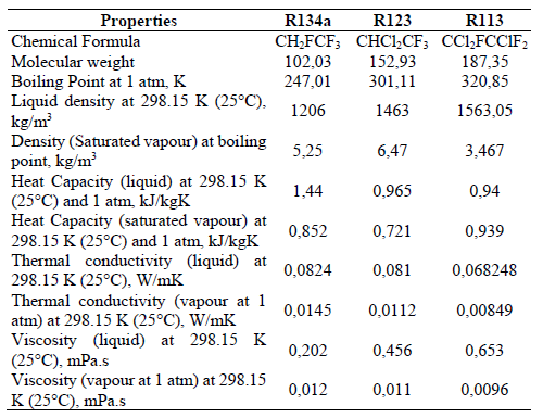 HFCs have better environmental characteristics than the CFCs because they contain no chlorine atoms and zero ODP. In [7] the authors present the R134a as an attractive option and a long-term alternative to replace R12 and R22. According to the information reported in the literature, R123 and R134a refrigerants were selected. Zeotropic and azeotropic mixtures were not chosen because their properties and characteristics are more complex for computational analysis to be undertaken. However, these mixtures are not discarded for further analysis. Additionally, testing with refrigerant R113, which has been extensively studied in experimental and computational evidence, was performed in order to have a point of comparison and validation of results.