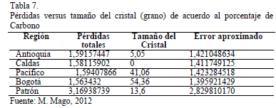 En la Tabla 7 se muestran resultados obtenidos de forma específica para la falla debido al arco eléctrico, regiones de procedencia y pérdidas. Estos valores fueron comparados con el tamaño de cristal (grano) en escala nanométrica y el error de aproximación. Los valores obtenidos son representativos en cuanto al tamaño de grano para todas las muestras, ya que las mismas están fuera de norma lo que indica posibles cambios en la estructura física del material no importando la región de procedencia. Al utilizar este método en la determinación de las pérdidas totales deben considerarse estos errores en los cálculos prácticos.
