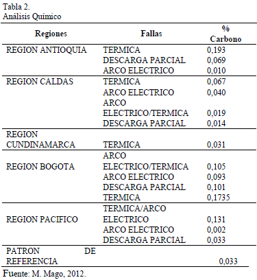 Se recolectaron muestras de equipos fallados procedentes de diferentes regiones de Colombia (Antioquia, Pacífico, Cundinamarca, Bogotá, y Caldas) las cuales corresponden a la población del estudio (Tabla 1), a las cuales se les realiza análisis químico para determinar el porcentaje de carbono con el equipo Spectrovac, Marca Baird (Tabla 2). Esta evaluación incluye dos (02) mediciones y el valor promedio verificando los contenidos de Hierro (Fe), Carbono (C), Manganeso (Mn), Fosforo (P), Azufre (S), Silicio (Si), Cobre (Cu), Niquel (Ni), Cromo (Cr), Vanadio (V), Molibdeno(Mo), Wolframio o Tusgteno (W), Cobalto (Co), Titanio (Ti), Estaño(Sn), Aluminio (Al), Niobio(Nb), Boro (B), Plomo (Pb), Magnesio (Mg). El porcentaje de carbono obtenido y comparado con el valor promedio es el referente utilizado para determinar las pérdidas totales del núcleo de los transformadores fallados.