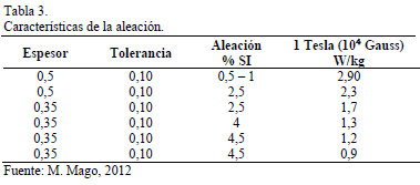 Es necesario verificar las características de la aleación utilizada en cuanto a espesor, tolerancia y porcentaje de silicio, a fin de comparar las pérdidas de potencia que establece el fabricante respecto a energía/peso (W/kg) (Tabla 3).