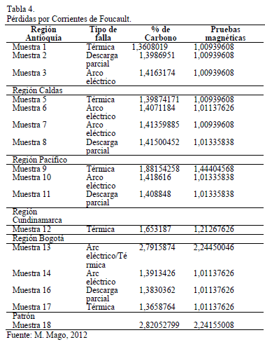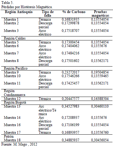 En las Tablas 4, y 5 se muestran los cálculos de pérdidas por Corrientes de Foucault, e Histéresis Magnética obtenidos de acuerdo al método propuesto, indicando en las mismas regiones de procedencia, tipos de fallas, valores obtenidos de acuerdo al porcentaje de carbono y las pruebas magnéticas. De estos resultados los más aproximados a los establecidos por el fabricante Acesita (Brasil) hoy APERAM, corresponden a las muestras 1, 5 y 17 procedentes de las Regiones Antioquia, Caldas y Bogotá debido a fallas térmicas, y la muestra 11 procedente de la Región Pacífico debido a falla por descarga parcial. En contraparte a los resultados obtenidos, al aplicar pruebas magnéticas se aprecia un margen de error entre cinco (5) y ocho (8) porciento. Estos datos sirven de referencia a los expertos que reparan o fabrican núcleos para estos equipos.