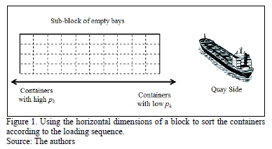 Several authors have addressed related problems in terms of yard management operations. One of the earliest works is by Kim [7], who estimated the number of moves to retrieve one container, both analytically and by simulation. Kim and Kim [8] extended previous study and incorporated yard cranes allocation decisions. Kim and Bae [9] present a model to minimize the number of export containers to be moved in the shortest possible traveling distance, considering a remarshaling strategy (containers are relocated in a dedicated space, near to the place in which the ship will be berthed). This paper does not consider a remarshaling strategy. However, the heuristic procedure proposed could be implemented for both a direct and remarshaling of containers storage space policy.