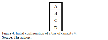 Suppose that the sequence to retrieve the containers according to the stowage plan is {A, B, C, D}. Three re-handles (D, C, B) are required to retrieve container A. Once container A was retrieved, two additional re-handles are required to retrieve container B. Then, one additional re-handle should be made to retrieve container C. The last container to be retrieved does not require re-handles, so the total re-handles required to retrieve all the containers are: 3+2+1 = 6. This configuration is the worst one possible due to the order of retrieving the containers being exactly the opposite of the order of the containers allocated in the bay.