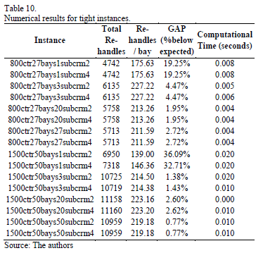 As we can observe from previous tables, tight instances present the lower gaps, with an average gap of 8.45%, and a maximum gap of 36%, which shows that are the hardest instances to be solved and the number of re-handles is closer to the expected number computed as an upper bound. It is important to notice that for this type of instance, better results are obtained for the 1500 size instances than for the 800 size.