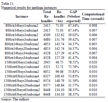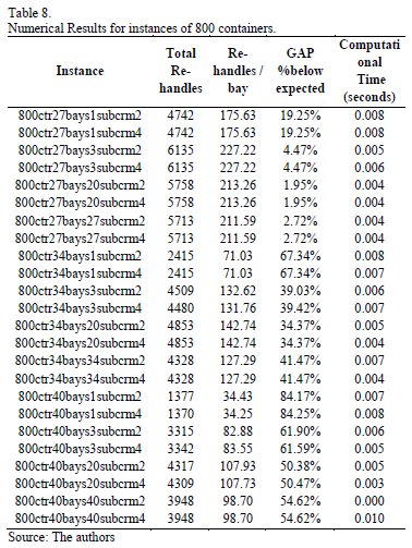 The value of the gap obtained may be interpreted as the percentage below the expected value of Re-handles. The bigger the gap, the better the algorithm performs. Tables 8 and 9 how the results for the 800 size and 1500 size instances respectively. We consider a single replicate for the 48 types of instances, which are refereed based on the values of its parameters. For example, the "800ctr27bays1subcrm2" is an instance with 800 containers, 27 bays, 1 sub-block and Crmax = 2. The tables present the total number of re-handles obtained by the solution, the number of re-handles per bay and the corresponding gaps and computation times. Gaps are expressed as a percentage value below the expected number of re-handles.