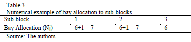 b) Number of bays that will conform each sub-block (N.). The procedure to compute N. is as follows: The number of sub-blocks (.) is an input parameter, so []bays are allocated to each sub-block. To complete allocating all the bays of each sub-block, one extra bay should be allocated to the first mod(N, n) bays. For example, with . = 20 bays and . = 3 sub-blocks, each of the 3 sub-blocks will contain 6 bays. Since mod(20, 3) = 2, sub-blocks 1 and 2 will each be assigned one extra bay. The final bay allocation to each sub-block is shown in Table 3. The sub-blocks are sorted according to their proximity to quay. In this example, sub-block number 1 is the closest to the quay while sub-block number 3 is the farthest from the quay.