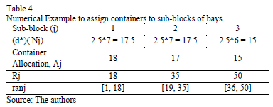 In order to illustrate previous procedure, consider the case with a value of . = 50 containers, . = 20 Bays, d* = 2.5 and . = 3 sub-blocks. After applying the previous steps, the final container allocation of each sub-block is presented in the Table 4.
