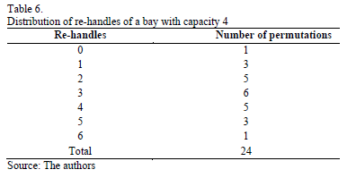 We may also use for comparison purposes the expected value of the number of re-handles for a bay with capacity .. To define this value we compute the distribution of the number of interferences and the number of permutations. For example, the same bay in the previous example with capacity 4 has 4! = 24 possible permutations. The minimum number of re-handles that can be obtained is 0 when the order of retrieving the containers is exactly the same as the order of the containers allocated in the bay. By generating the 24 permutations and the number of re-handles in each permutation, the corresponding distribution obtained is that shown in Table 6.