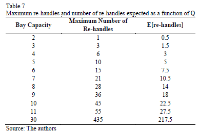 The previous procedure was applied to different values of the capacity of a bay in order to obtain the corresponding value of the maximum and expected number of re-handles, as shown in Table 7.