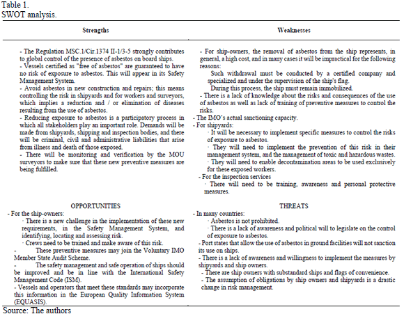 Defensive strategy (weaknesses & threats): with the conviction that these preventive measures will favor the health of crews, it will be possible to conduct risk assessments for exposure to asbestos, specific medical examinations in shipyard workers, crews and surveyors, and monitor the implementation of preventive measures.