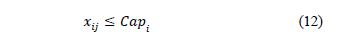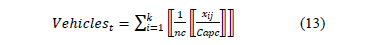represents the forecasted demand for product i in period j. The transportation quantities and their respective costs will depend on the number of vehicles to be used (Vehiclest), which depend on the number of compartments, nc, and these, depend on those compartments' capacities, Capc, assuming equal values. Dividing the quantity to order xij into Capc, generates a number of compartments, and the maximum integer value of this number is divided into nc, producing the total number of vehicles required, as represented by eq. (13), which can then be substituted into the objective function shown in eq. (10).
