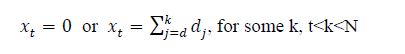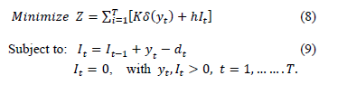 Some classical inventory models were formulated based on Wagner and Whitin's proposed [53] cost minimization. These authors specify that an order could be '0' or the sum of some demands, and they formulated schemes for ordering (i.e., choosing between generating orders or not) in every period t.