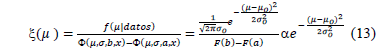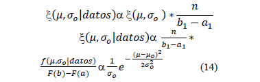 The data distribution is uniform (Data-unif(a1,b1)). Let '' be the mean value of this distribution, with a prior Normal truncated distribution with the following parameters: µo, mean; s., standard deviation (assumed to be constant); a, inferior limit; and b: superior limit (10).