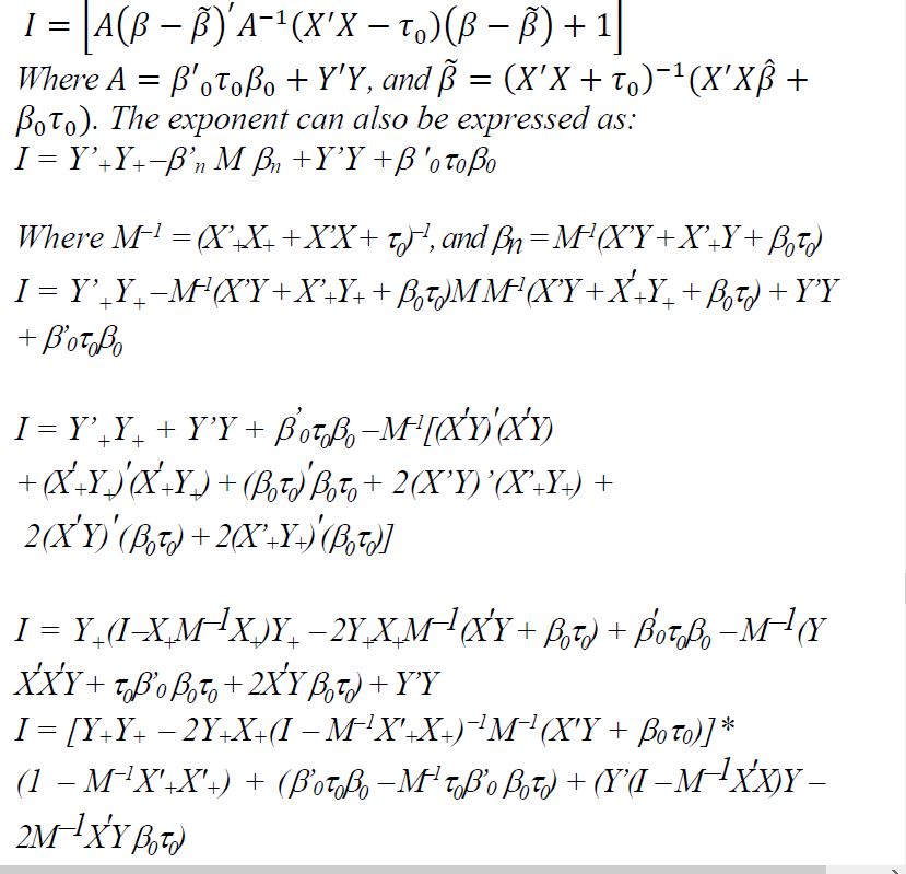 The likelihood function of the data, based in the Normal distribution, is shown in eq. (2), a prior Normal distribution for the b parameter vector, in eq. (3) and the posterior distribution is (4), obtained after the product of the prior times the likelihood, and the algebraic process. Here