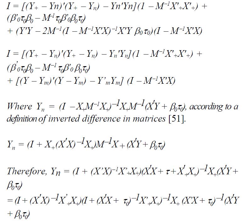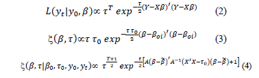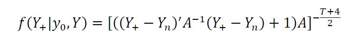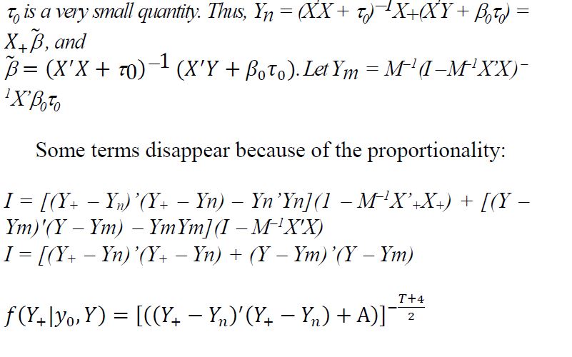In [51], Zellner presents a BRM based on a diffuse prior distribution of b parameters. In this work, a different model will be presented: the novel BRM described in thesis above [37]. The model presented there assumes a Normal prior distribution for the vector parameter and applies an iterative process to the initial vector for every time t; however, its accuracy parameter is fixed: t0 = 1/., The predictive distribution used for forecasting is derived in the thesis and is a Student's t-distribution; this derivation is also presented in the appendix of this paper.