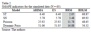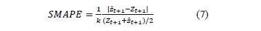 The SMAPE of the forecasted values is used as the criterion for identifying the best model, and it is calculated with eq. (7) according to [36], after estimating each of the four models being compared: ARIMA, ES, BRM, and BDLM.