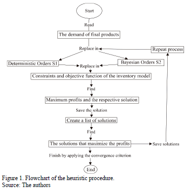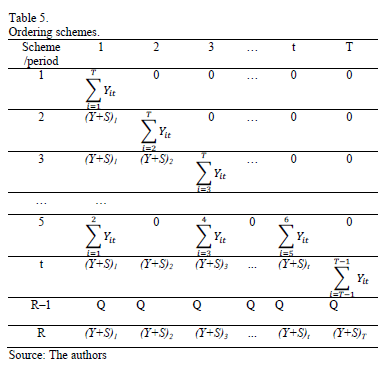 Two types of schemes are used for ordering: S1 and S2; the model is described above. These schemes are substituted into the model described by eqs. (10)-(13), and the best solution is retained for posterior comparison and profit maximization with the results obtained after the process repetition, by using the random variable S, which is added to the orders (Table 5), and it facilitates finding the best possible solution for the simulated period.