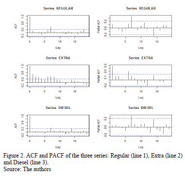 Fig. 2 presents the autocorrelation and partial autocorrelation functions (ACF and PACF, respectively), they show that the time series exhibits dependence of different orders (i.e., Regular, Extra and Diesel fuels).