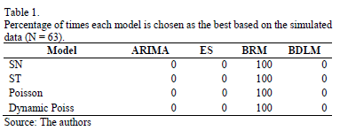 This process is repeated a thousand times, and the program calculates the percentage of selection for every model and simulated case. The results of the frequency with which each tested model is chosen as the best model are shown in Table 1. For all simulated time series, the BRM is identified as the best model.