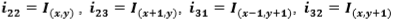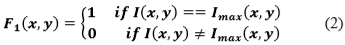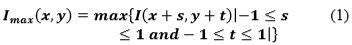 Let .(x,y) be a bidimensional intensity function (a matrix) where x and y are the spatial coordinates of a pixel; let Imax.x,y) be the local maximum value within a window of 3x3 pixels, being: