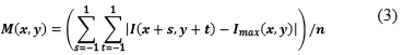 Let M(x,y) be the maximum absolute deviation (Eq. 3), which determines the sufficient variance in intensity, with n being the number of elements, and let Imax.x,y) be the local maximum value (Eq. 1). Then, let m be a threshold that determines the sufficient variance in intensity of I(x,y).
