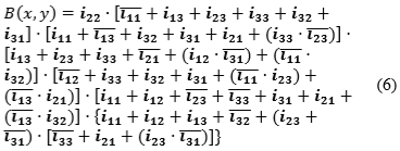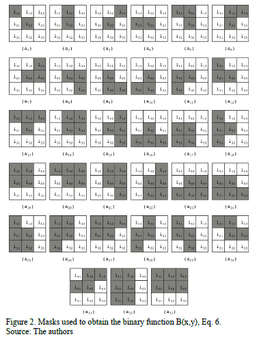 ; which means that the central element is eliminated to avoid over-detection. Thus, every element from Fig. 2 can be represented by a binary function where the central element i22 has been eliminated, and it is based on that fact that every element can be represented by a binary function, and the combination of all these functions yields cell location. This equation was reduced by the Quine-McCluskey method; afterward, Postulates and Theorems of Boolean Algebra were used to minimize it. This binary function is applied onto the image I(x,y). Later, the obtained image is rotated 180 degrees, H(x,y) = rotate180(B(x,y)), with the goal of eliminating the multiple detection in the opposite direction. Then, Eq. 6 is applied onto the rotated image H(x,y). Finally, the result is rotated back to the original orientation. This process is performed until algorithm convergence is reached.
