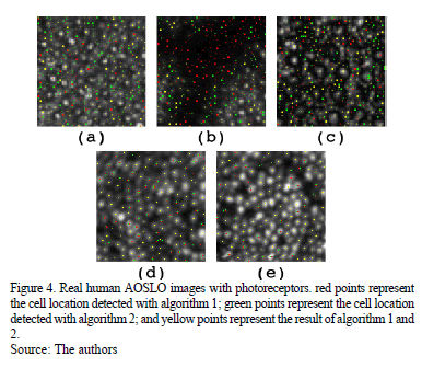 When the algorithm was applied to real images that included cones, rods and vascular tissue, Fig. 4 (a - c), the algorithm developed by Li and Roorda [6] showed detection of cells in the vascular tissue, as well as poor detection of rods. It is evident that there are photoreceptors in these zones, but since the vessels cause the photoreceptor layer to be below or above the blood vessel, it cannot be stated that photoreceptor detection in this zone is adequate.