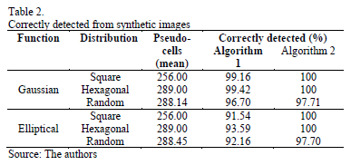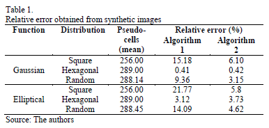 For each function-distribution combination, 1000 synthetic images of 100x100 pixels in size were generated. To those images, we applied algorithms 1 and 2, and the results obtained were later evaluated. The outcome of such evaluation is shown in Tables 1 and 2. Table 1 shows the relative error obtained for each of the combinations, whereas Table 2 shows the number of cells that were correctly detected as corresponding exactly with the place where the center of the pseudo-cells had been positioned.